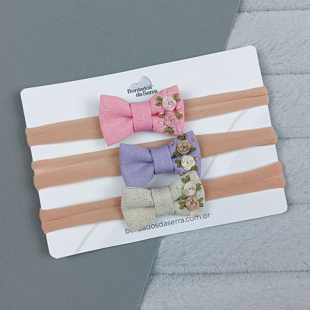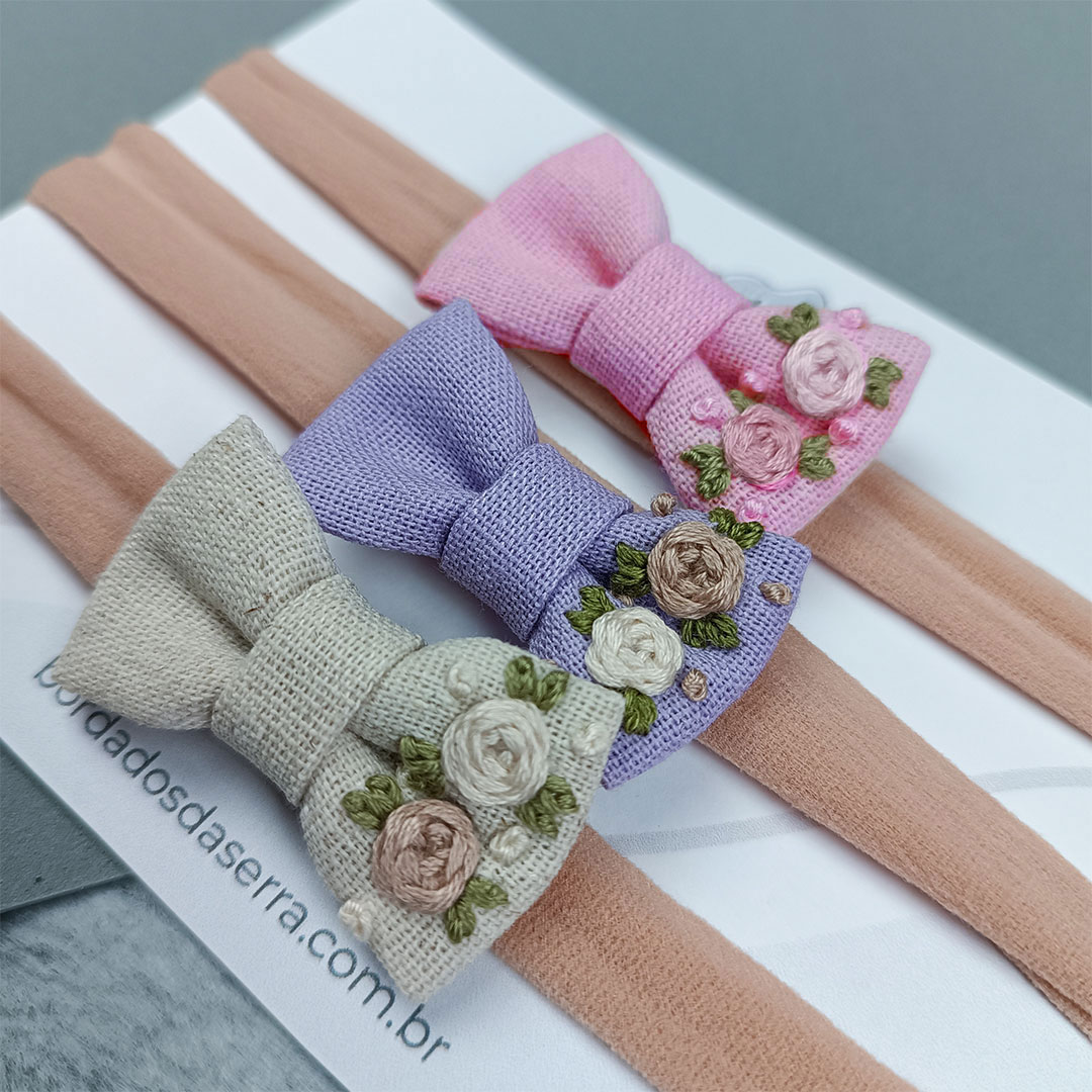 Lacinho delicado e cuidadosamente bordado à mão. A faixinha de meia de seda é super flexível e confortável, se adaptando à cabeça do bebê e permitindo seu uso até os 2 anos de idade. Um acessório feito com carinho para momentos especiais.