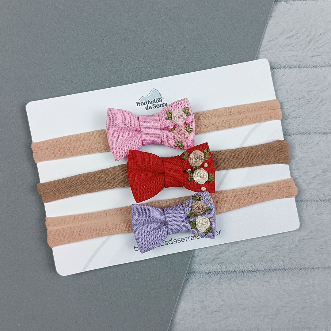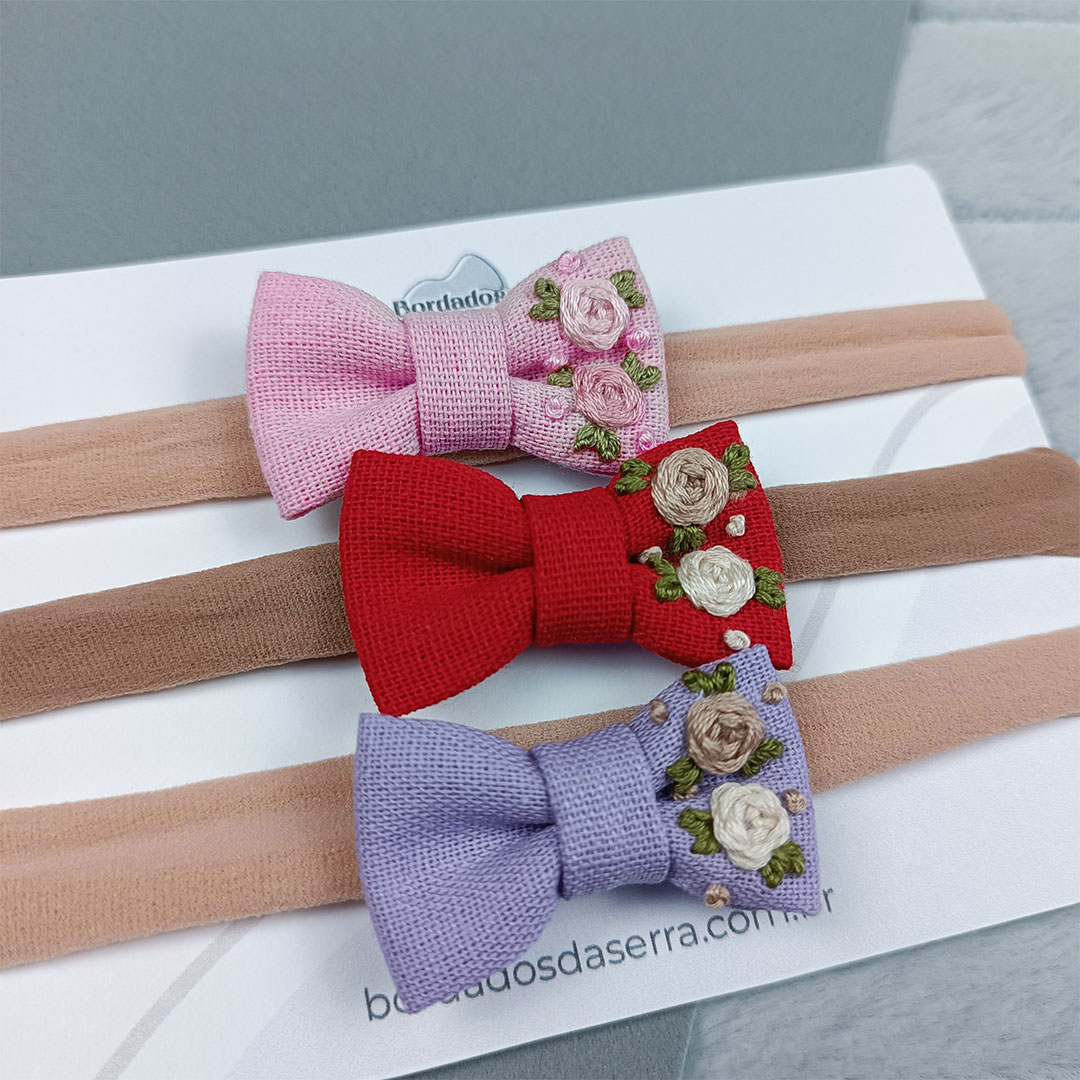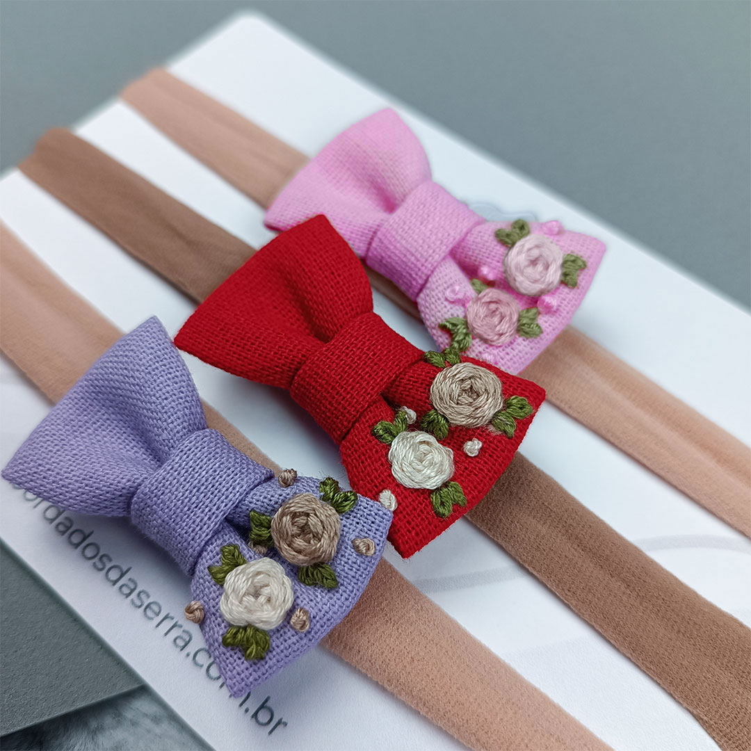 Lacinho delicado e cuidadosamente bordado à mão. A faixinha de meia de seda é super flexível e confortável, se adaptando à cabeça do bebê e permitindo seu uso até os 2 anos de idade. Um acessório feito com carinho para momentos especiais.