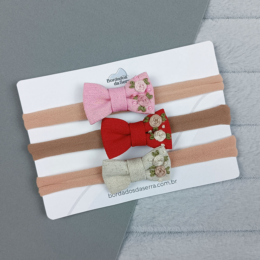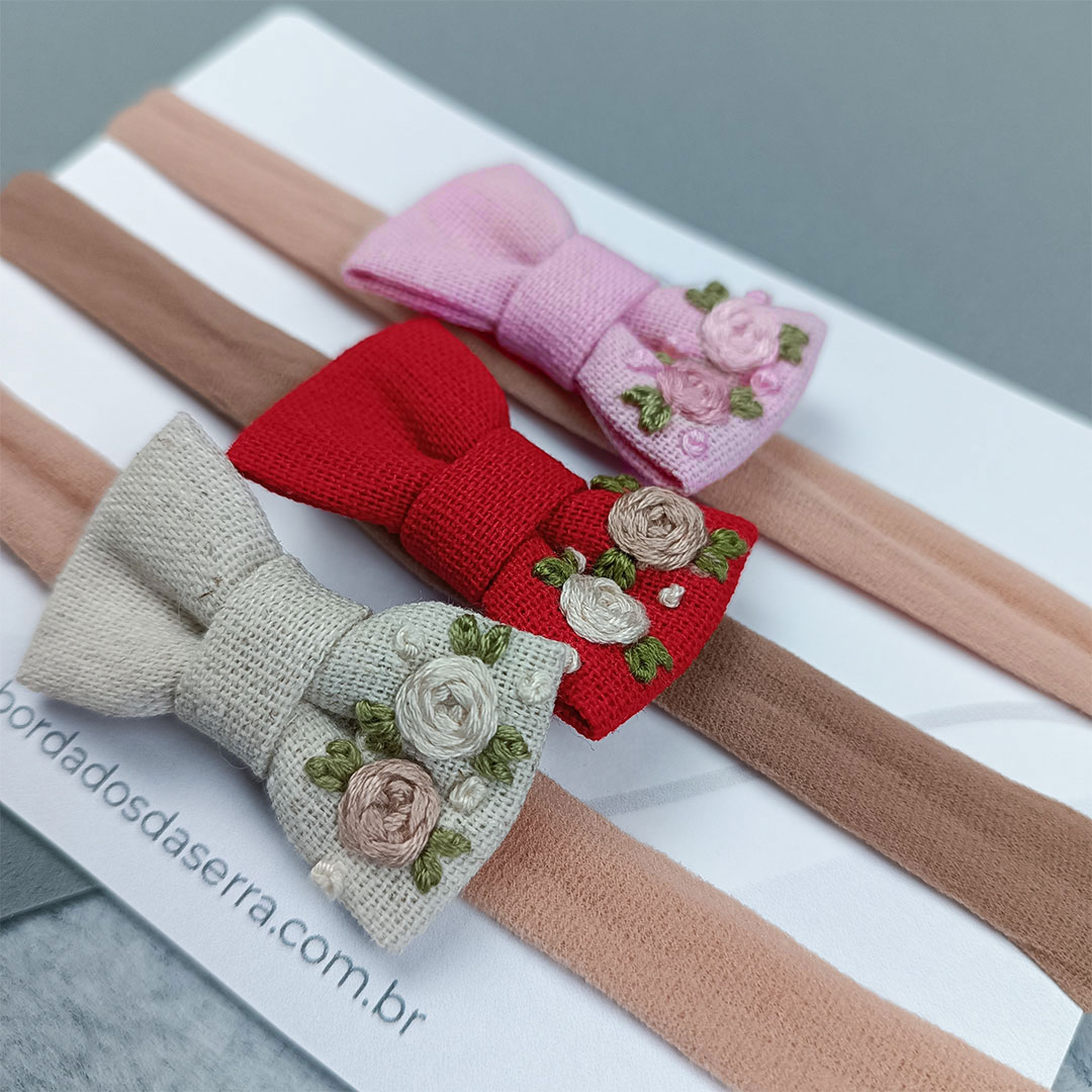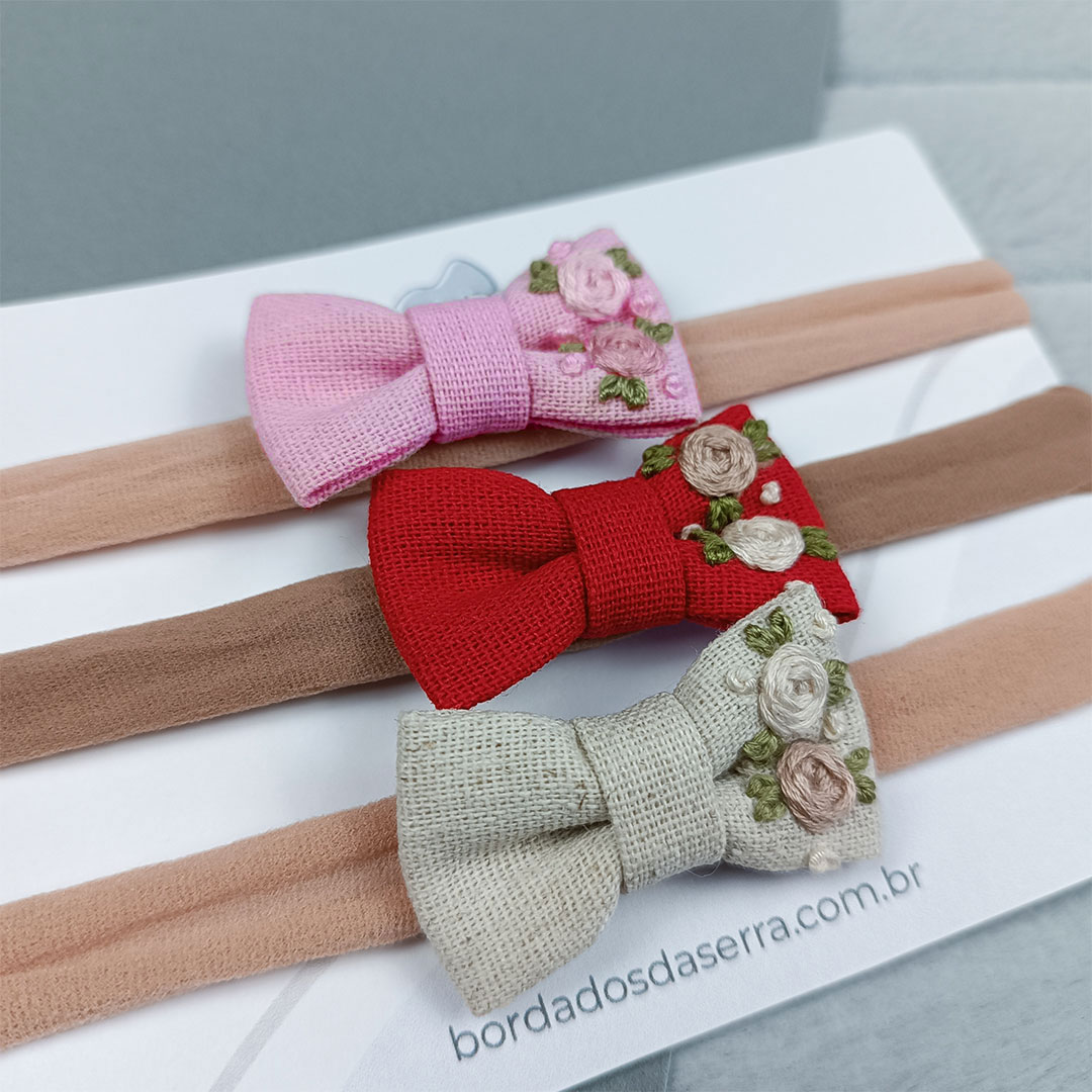 Lacinho delicado e cuidadosamente bordado à mão. A faixinha de meia de seda é super flexível e confortável, se adaptando à cabeça do bebê e permitindo seu uso até os 2 anos de idade. Um acessório feito com carinho para momentos especiais.